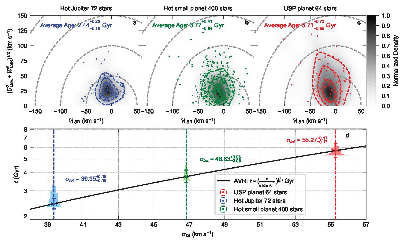 图1:超短周期行星(红色)、热木星(蓝色)和短周期小质量行星(绿色)的宿主恒星在银河系运动速度分布和运动学年龄的比较。