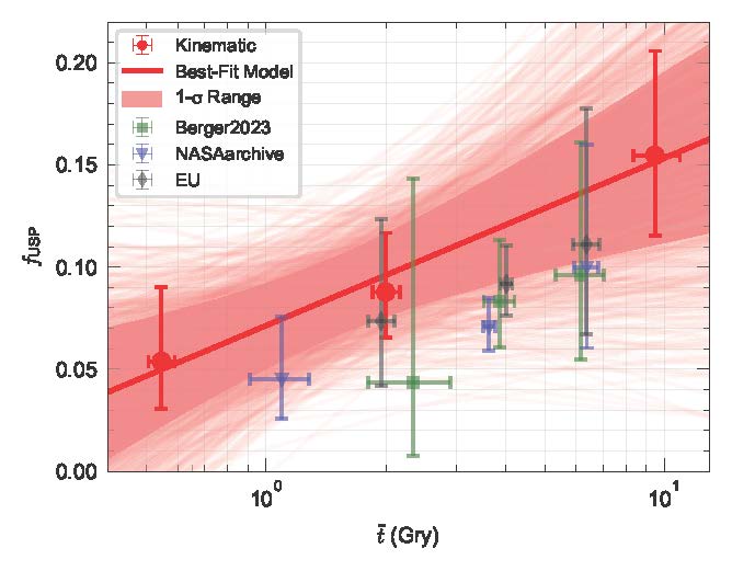 研究团队进一步分析,得出了超短周期行星系统的出现率随年龄的演化规律,发现超短周期行星系统的出现率随年龄增长而上升(图2)。这一发现表明,大多数超短周期行星可能是在数十亿年之后形成的,不太可能以极早期形成模型(如盘迁移模型)为主要形成途径。