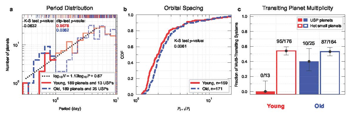 图3:年轻与年老的超短周期行星系统及短周期小质量行星系统之间轨道构型的比较。左、中、右分别为轨道周期分布、轨道间距分布,以及多凌星系统比例的比较结果。