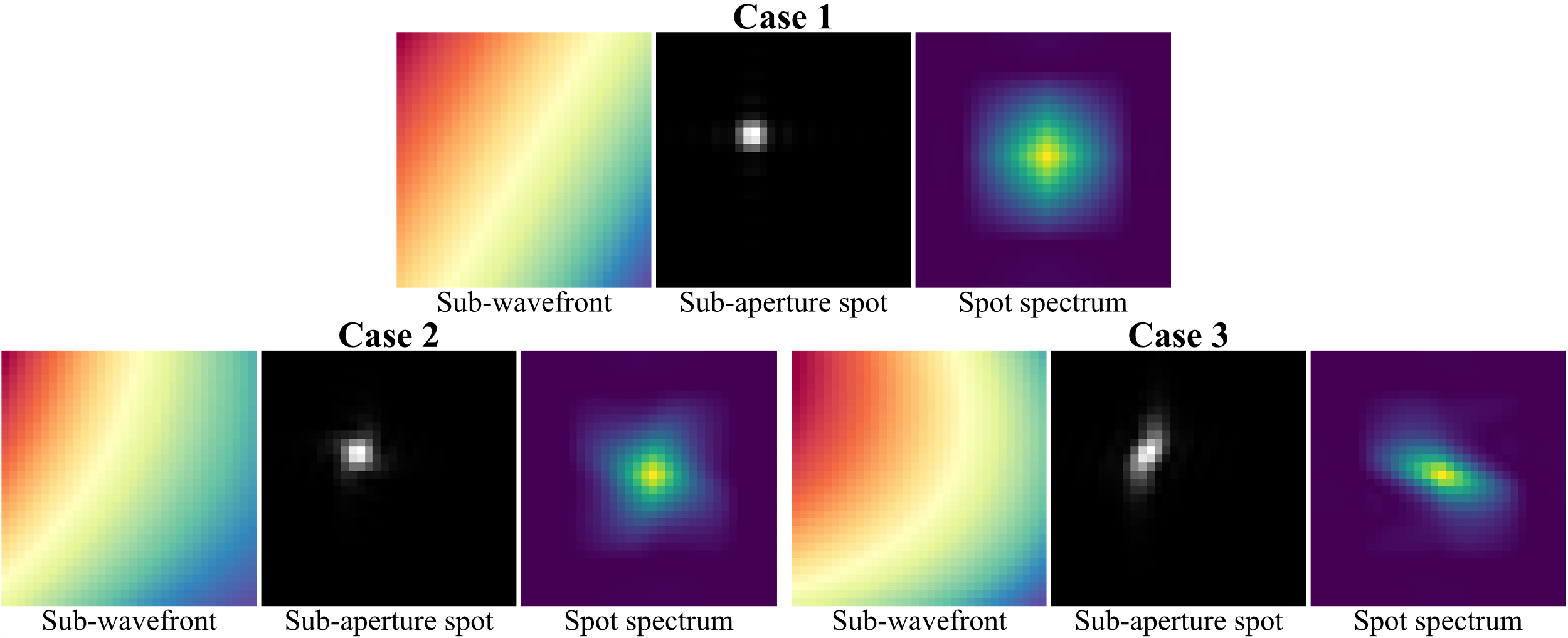 图2 三种情况下的子波前、子孔径光斑及对应的光斑光谱。