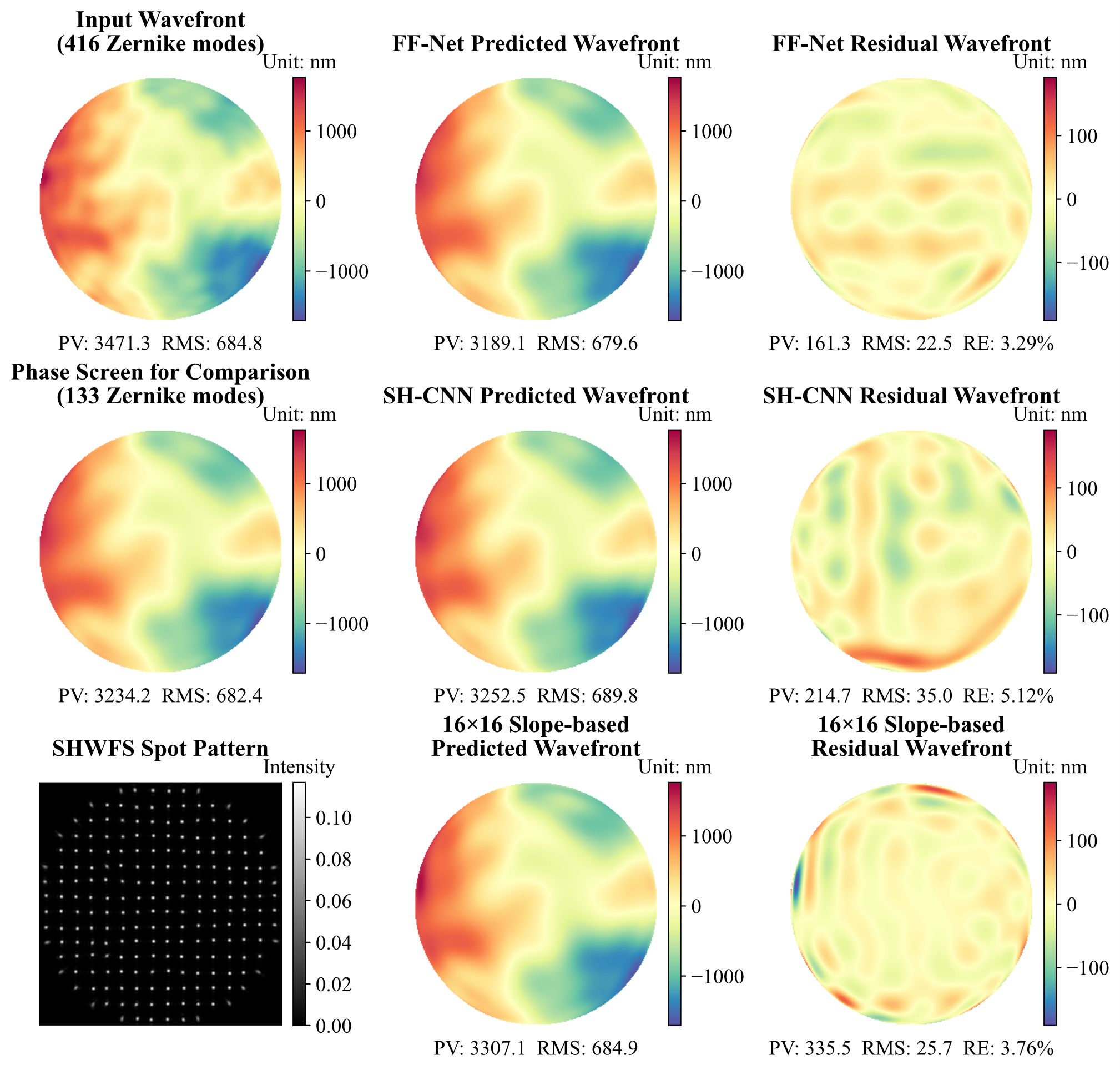 图4 FF-Net、SH-CNN与斜率法进行波前重构的结果对比:重构133个泽尼克模式(深度学习方法使用8×8微透镜阵列,斜率法使用16×16微透镜阵列)。