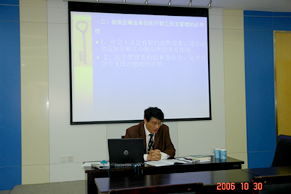 10月30日下午,南京天光所工会邀请省教科工会朱建民副主席来所给新一届职工代表做了《深化职工民主管理 推进构建和谐院所》的讲座,张丽萍书记、栗效东常务副所长、各实验室和职能部门负责人以及各支部书记也都参加听取了演讲。朱建民副主席紧密联系我院“三个条例”,从职工民主管理的基本理论、职工代表大会制度的基本要求和职代会召开的组织工作程序三方面做了详细的讲解,讲座有理论有实践,具有很强的指导性和可操作性,为促进我所民主管理、加强职代会建设、构建和谐院所起了正确指导和推波助澜的作用。