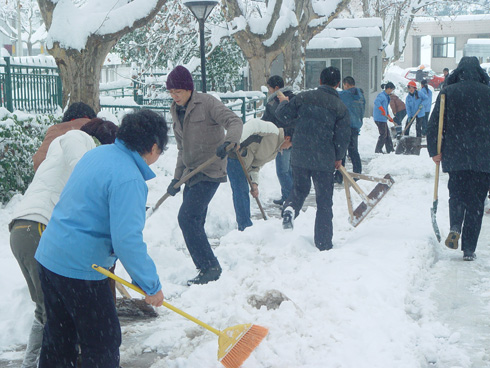 连日来的强降雪天气,使得积雪接近历史极值,及膝的积雪给大家出行、上班带来了极大的不便。在所领导带动下,今天一早刚刚赶到所里上班的职工放下手中的东西就纷纷扛着铁铲、木推、大扫帚加入了扫雪的队伍,清扫积雪。他们中有科研人员、有技术支撑人员、有管理人员、还有我们的研究生。雪还在纷纷地下,可大家全然不顾满头满脸的雪水伴着雪花,依然干劲十足,有的在前面扫除积雪,有的则在后面奋力铲冰,欢声笑语中,团结协作下,真是人多力量大,很快便清理出了一条通行的道路。