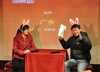 伴随着朱永田所长热情洋溢的祝酒辞,大家举杯同庆,晚会拉开了序幕。当主持人头戴兔子耳朵上台时,台下响起了热烈的掌声,接着同学们也纷纷拿出自己的绝活,各展才艺,整场晚会歌曲、相声、小品、才艺表演一应俱全,还有搞笑的相声小品、好玩的游戏,尤其是同学们自编自演的相声《广告》和小品《华山论剑》,赢得满堂喝彩,掌声阵阵。这些形式多样的节目将同学们青春的色彩诠释得淋漓尽致。看着台上同学们精彩的表演,老师们也不忘助兴,章海鹰老师一曲《神话》将晚会推向了高潮。