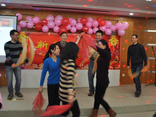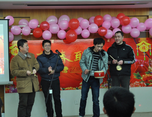 各部门会前进行了认真准备,联欢会上自编自导自演的节目精彩纷呈。在工会的精心组织下,此次联欢会突破以往演唱为主的表演形式,节目类型更加丰富多彩,有演唱、诗朗诵、舞蹈、乐器演奏、三句半、相声、游戏等,令人陶醉其中。欢声笑语在会场回荡,到处洋溢着新春祥和、欢快的气息。望远镜工程中心的《三句半》诙谐地说出了职工们的心声,李晓燕博士和卢海平博士的诗朗诵《宫保鸡丁》让人忍俊不禁,尤其是管理部门为大家带来的《江南Style》搞笑模仿秀俏皮幽默,引爆了现场的人气,将整场联欢会的气氛推向了高潮。