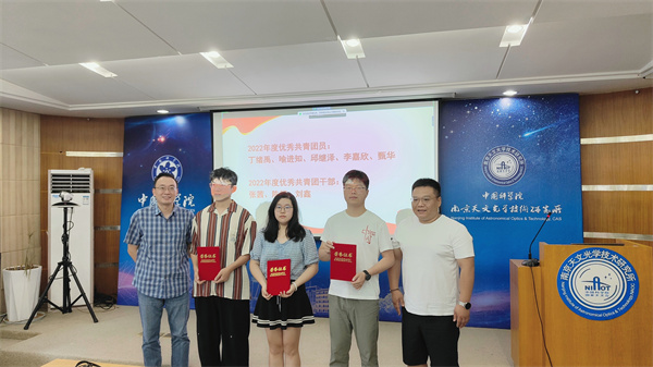 最后,李正阳主持了表彰仪式。丁绪禹、喻进知、李嘉欣、甄华、邱继泽荣获2022年度南京天光所优秀团员,陈超、刘鑫、张茜荣获2022年度南京天光所优秀团干部。袁书记为优秀团员颁奖,任书记为优秀团干部颁奖。优秀团员及团干部代表进行了发言,分享了他们在学习和工作中的心得与体会,并对即将毕业的南京天光所学子送上了最真挚的祝福。