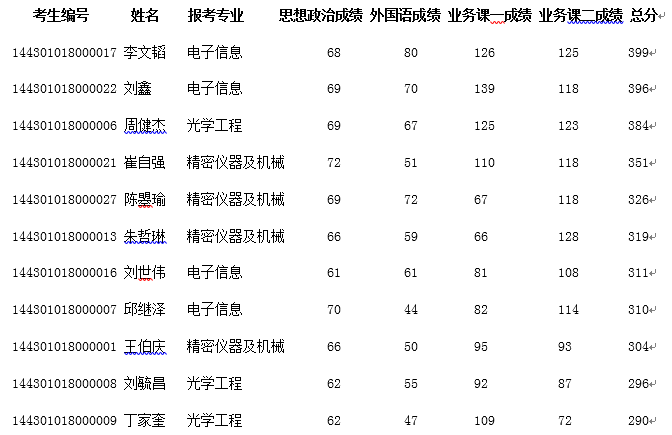 考生编号 姓名 报考专业 总分