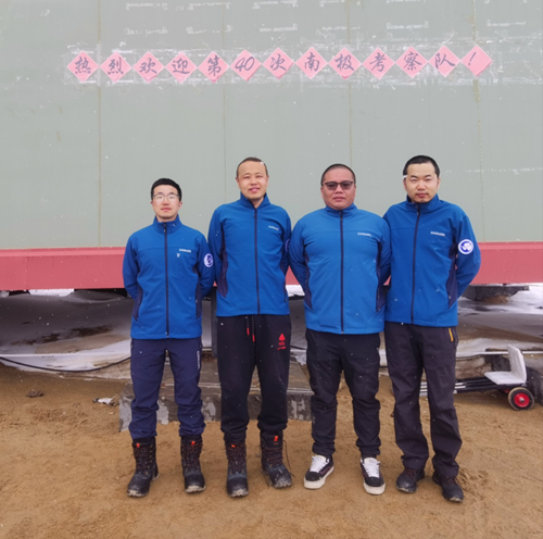中国第40次南极科学考察内陆队天文队员在中国南极中山站。左起:李运(南京天光所)、孙士杰(国家天文台)、李正阳(南京天光所)、张翼龙(紫金山天文台)