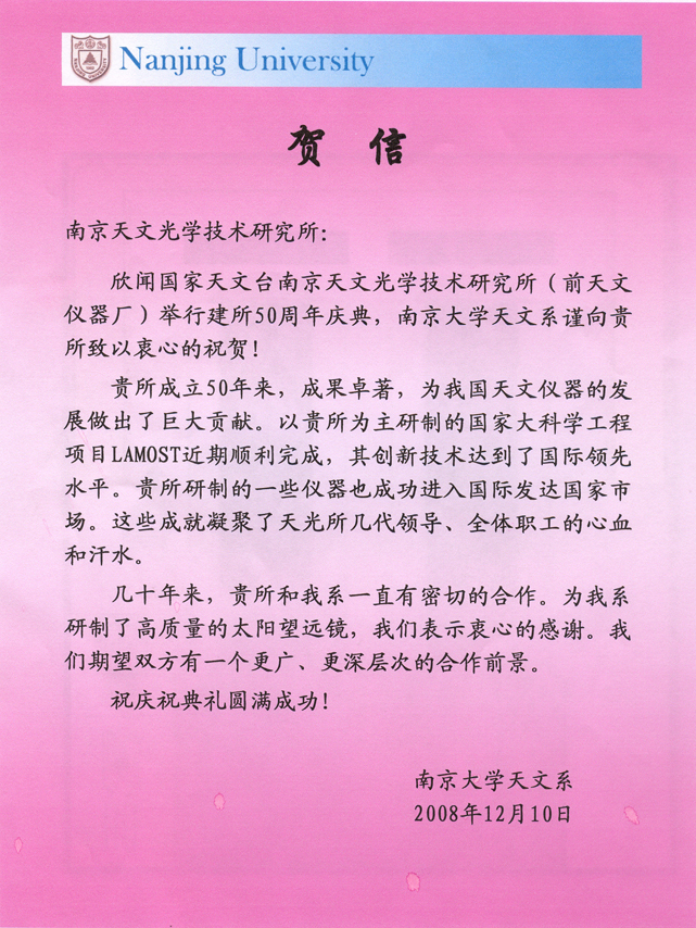 南京大学天文系发来的贺信