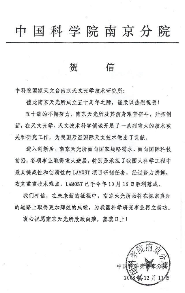 中国科学院南京分院发来的贺信