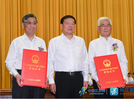 娄勤俭向2019年度省基础研究重大贡献奖获奖者宣益民院士(右)、祝世宁院士(左)颁发奖励证书并合影