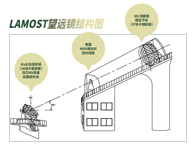 因王绶琯与苏定强的“双打获胜”,LAMOST的光学系统被我们称为“王-苏主动反射施密特系统”。其望远镜镜筒(焦面和球面镜)固定在正南北方向,由主动变形镜实现Mb的球差改正和天体的跟踪。LAMOST配备口径为5.7米×4.4米的主动变形镜Ma(由24块主动变形子镜拼接而成),和口径6.7米×6.1米的球面镜Mb(由37块子镜拼接而成);在观测过程中,拥有5°的超大视场(线直径1.75米——世界最大焦面);配备4000根光纤,可同时对4000个天体进行观测,观测天区覆盖赤纬-10°到+90°的广阔区域。