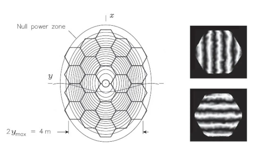 左图:LAMOST曲率变化的主动变形镜,LAMOST望远镜拼接式主镜及其最大椭圆率等值线图——对应于天区赤纬δ=90°的平面基准。右图:自准直测试中正交双通路的氦氖激光波前图呈现最边缘受应力镜片对的形变状态。来源/Gerard R. Lemaitre,《Astronomical Optics and Elasticity Theory》,Springer,2009