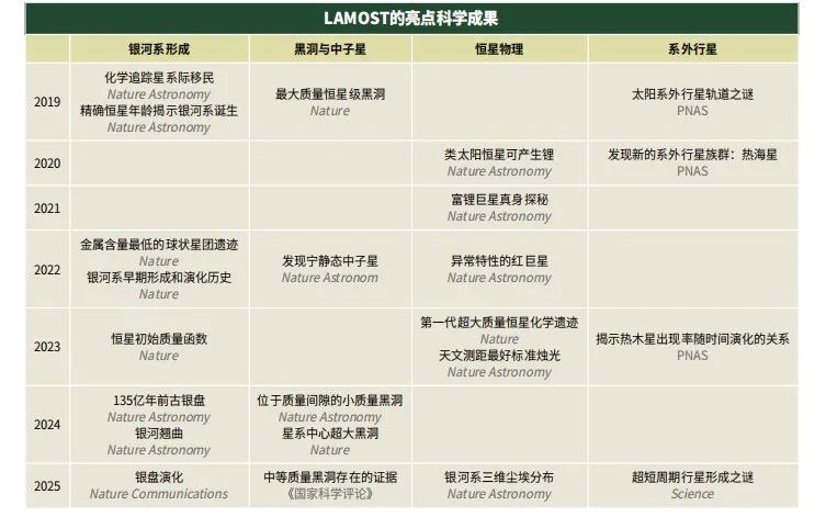在科学研究成果方面,LAMOST取得一系列瞩目成就。其在银河系结构、恒星物理和特殊天体搜寻等天文前沿领域不断取得突破性进展,在国际顶级学术期刊《自然》上发表文章6篇,在《自然》子刊上发表17篇,在《科学》上发表1篇。2022年以来,在全球正在运行的10个口径六米及以上的中大型望远镜项目(有的是2-4架望远镜)科学产出排名中可知,LAMOST的科学产出已经超过世界上任何单架8-10米望远镜。LAMOST的数据资源受到国际天文学界的广泛关注和高度认可,外国天文学家用其数据发表的文章占比已超过44%,国际国内236所大学和研究机构的1707位用户运用LAMOST的光谱数据开展科研工作。