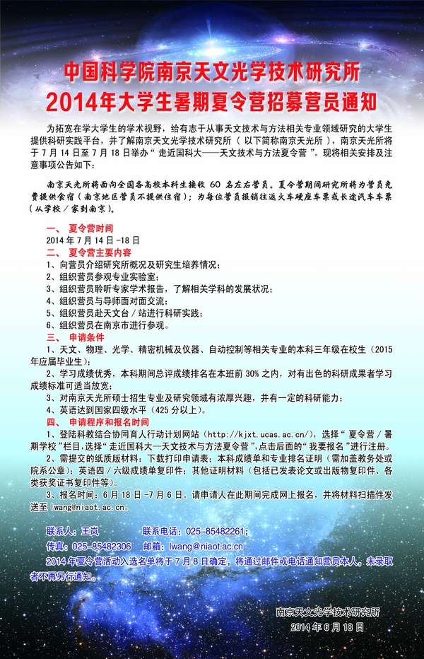 中国科学院南京天文光学技术研究所2014年大学生暑期夏令营招募营员通知