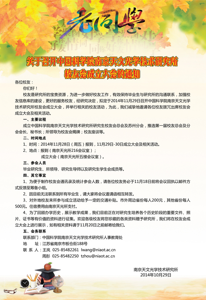 关于召开中国科学院南京天文光学技术研究所校友会成立大会的通知