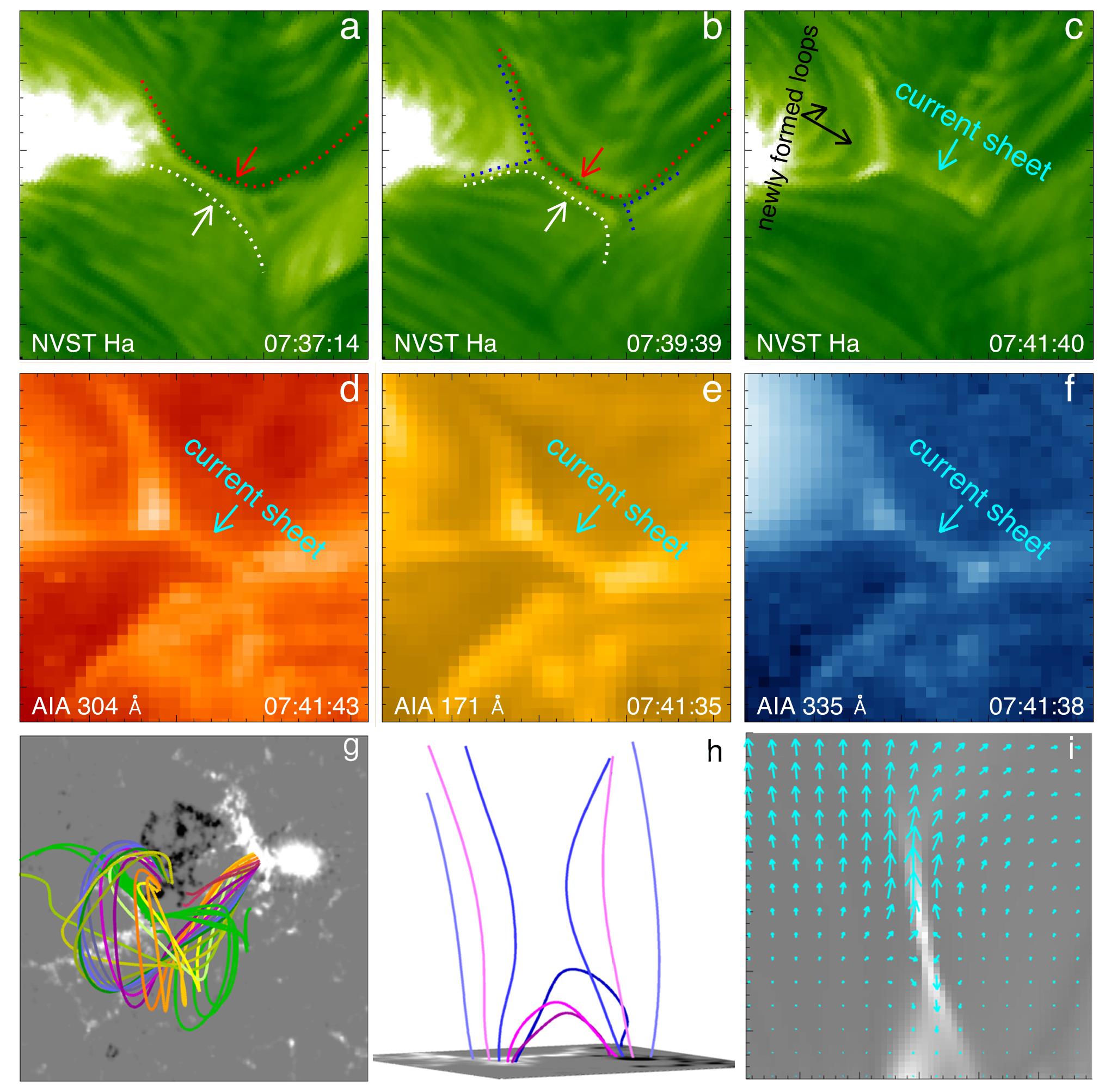 MHD数值模拟重现了暗条爆发过程中磁重联的产生如图g-i所示。