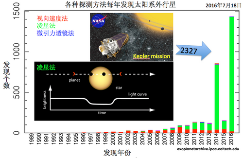图1:不同观测方法每年发现系外行星的个数。凌星法就是通过捕捉行星在视线方向上穿越恒星表面引起的恒星可视光度变化来探测系外行星。凌星法的杰出代表是Kepler卫星计划。Kepler目前发现了2327颗系外行星,约占所有已知系外行星总数的三分之二。