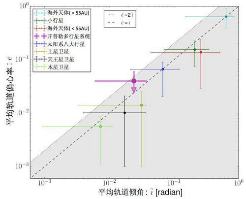 图4:Kepler卫星观测到的多行星系统与太阳系各类天体的轨道偏心率和倾角都符合e=(1~2)*i的规律。图中各点分别代表太阳系8大行星(蓝色),海王星外小天体(红色和浅蓝色),小行星带天体(绿色),各大行星的卫星(左下:黄色,黑色,黄绿色)以及Kepler发现的多行星系统(紫色)。