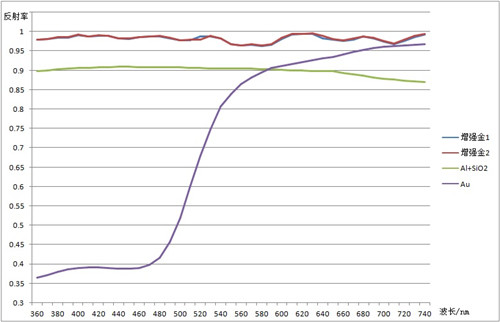 金是用于红外波段的反射涂层材料,其在红外波段具有很高的反射效率且金膜非常稳定,不与空气中的酸、碱物质反应,但其波长在短于600nm后反射效率迅速下降,无法用于可见光及紫外波段。