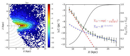 左侧是银河系银盘外围部分的恒星分布密度切面图,红色是恒星空间分布密度高,蓝色分布的密度低。太阳在白色圆圈处。右侧是把Z方向恒星加起来得到的径向恒星数密度分布图,可以看到银盘(红色虚线)平滑地延伸到将近19千秒差距。