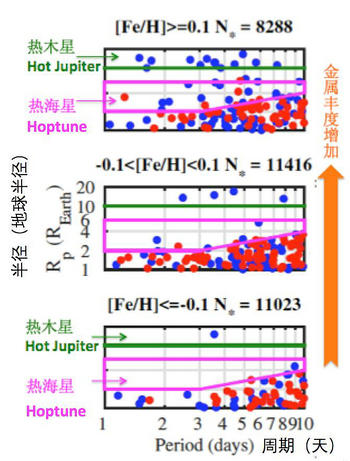 热海星的发现。不同金属丰度([Fe/H])下的行星轨道周期(Period)和行星半径(RP)的分布。从下至上,金属丰度增加。蓝色的点表示单凌星系统(系统中只发现这颗行星),红色的是多凌星系统。热木星的区域是在绿色横线的上端。粉色线段围成的就是热海星区域。LAMOST观测提供精确的宿主恒星半径和金属丰度。恒星半径进而用于确定行星的半径(开普勒卫星测光观测只能给出行星和恒星的半径比)。