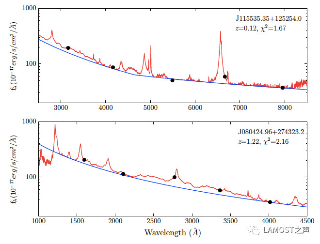 图1: 两个LAMOST类星体光谱(红色)和SDSS测光数据(黑色)的比较。蓝色曲线是拟合的连续谱。