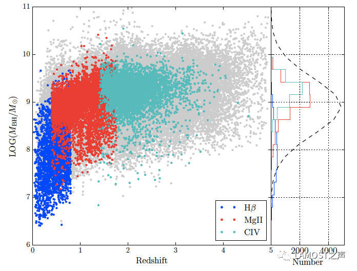 图2:LAMOST类星体的红移和黑洞质量分布及与SDSS类星体(灰色点)的比较。深蓝色、红色和浅蓝色分别代表用氢(Hβ)、镁(MgII)和碳(CIV)发射线得到的黑洞质量。