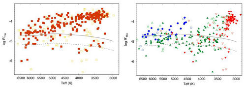 对同年龄恒星而言,质量小的恒星其色球活动水平整体上要强于质量大的恒星。从100兆年昴星团到600-700兆年的鬼星团及毕星团,较大质量恒星如GK型星色球活动水平逐步降低;M1-M2型星的色球活动时标至少在600至700兆年。