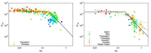 Hα剩余发射强度与自转参量Ro(Rossby数)的关系。颜色从蓝到红表示温度从6500K到3000K。