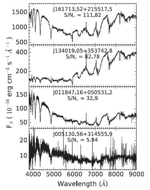 LAMOST WDMS 双星光谱示例(从上往下,信噪比递减)