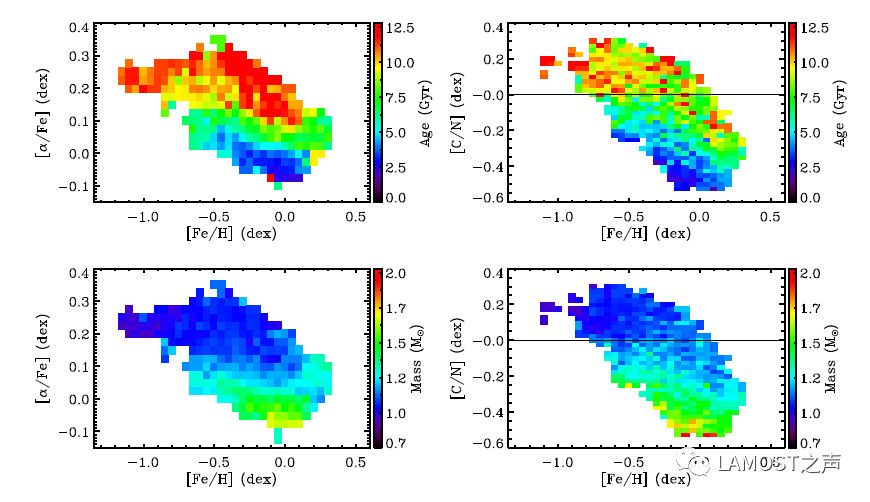 上图为恒星的中值年龄在[alpha/Fe]-[Fe/H]、[C/N]-[Fe/H]的分布图。下图为恒星的中值质量在[alpha/Fe]-[Fe/H]与[C/N]-[Fe/H]的分布图。颜色棒代表的是小网格中恒星的中值质量和年龄,网格的大小为0.05*0.025dex。