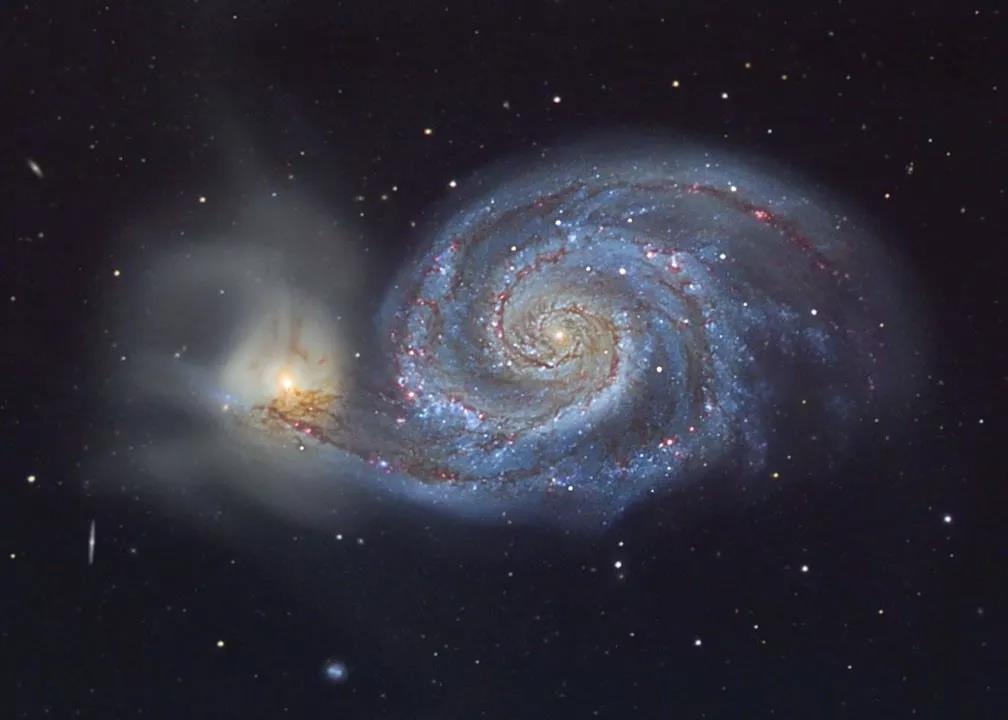 图1. 著名的相互作用星系对M51。其由大的星系为M51a(右),小的为M51b(左)。