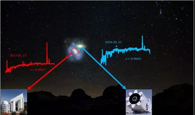 图2. 一个典型星系对的观测和证认过程。其中,两个星系的光谱观测先后由斯隆数字巡天(蓝色)和郭守敬望远镜(红色)完成。只有同时获得两个星系的红移(距离),才能最终证认这两个星系是在空间中是真实的成对还是由投影效应所造成。
