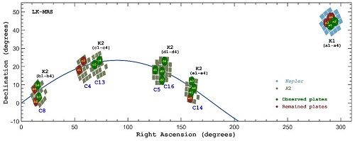 美国Kepler空间望远镜于2009年-2013年对天鹅座和天琴座附近的原始天区进行了长达四年的连续观测;接着Kepler卫星于2014年启动了观测的第二阶段,简称K2。K2在黄道面上共观测了20个天区,每个天区时长约80天,并于2018年正式结束任务。Kepler在长达十年的任务期中,共观测了超过70万颗目标源,为系外行星、恒星物理等多个领域带来了许多突破性进展。LAMOST是对这些目标源进行光谱观测的理想地基望远镜。