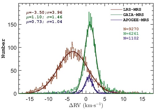 图2:LK-MRS中分辨数据与其它光谱巡天数据的视向速度比较。