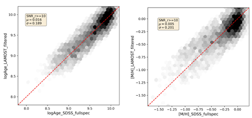 LAMOST巡天和SDSS同源光谱的星族成分分析。纵坐标为新方法获得的LAMOST星系光谱的星族平均年龄(左)和金属丰度(右),横坐标为采用经典方法对同源SDSS光谱分析得到的结果。