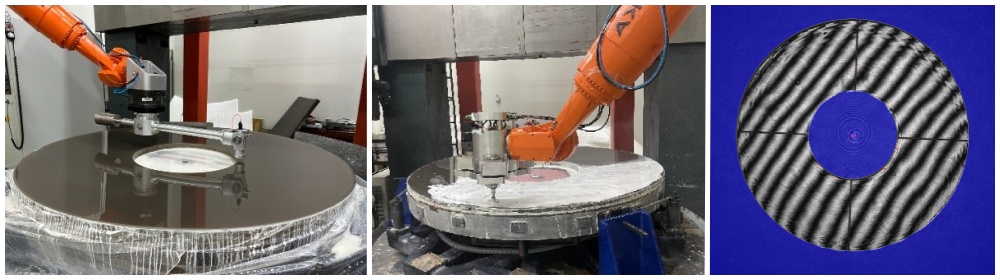 机器人-摆臂轮廓仪对镜面检验(左);并联平转行星研磨工具进行精修抛光(中);镜面干涉条纹(右)