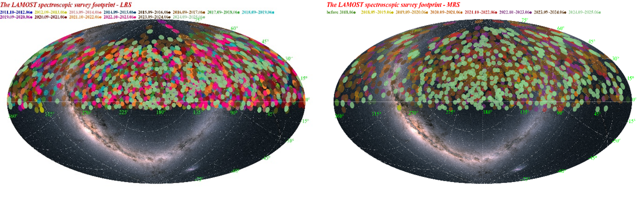 左图为LAMOST DR13的低分辨率天区覆盖图,右图为DR13的中分辨率天区覆盖图