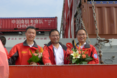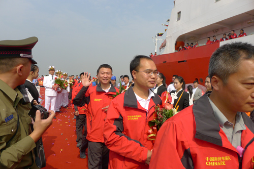 2012年11月5日上午,中国第29次科学考察队暨“雪龙”号科学考察船欢送仪式在广州南沙沙仔岛码头隆重举行。南京天文光学技术研究所的副研究员徐灵哲和来自极地中心天文室的周宏岩教授和田启国博士3位天文科考队员随船出发,这已是我国天文学家连续第6年出征南极冰穹A。南京天光所已连续五年选派科研人员参加南极科考,所党委书记兼副所长张丽萍和南极巡天望远镜课题负责人袁祥岩以及中国南极天文中心副主任商朝晖专程前往送行。