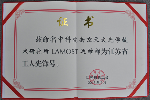 在庆祝“五一国际劳动节”来临之际,经天光所工会、职代会、省教科工会的推荐, 南京天文光学技术研究所LAMOST运维部团队被授予“江苏省工人先锋号”荣誉称号。