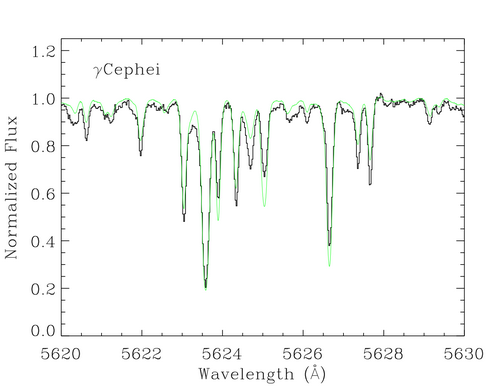 1. Gamma Cephei的一段光谱。曝光时间120秒,R=80000S/N=140,视向速度精度约为3/秒。叠加的绿色实线是Arcturus的高分辨标准光谱。