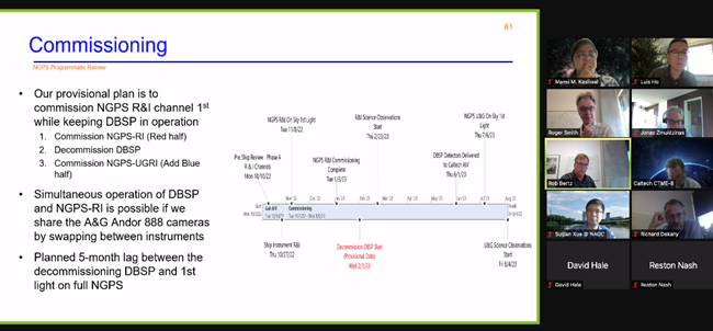 NGPS项目经理Rob Bertz详细汇报了项目组织管理、进度安排、经费预算以及风险评估等情况。技术团队各子系统负责人分别汇报了子系统的进度安排、设计要求与进展情况。中方技术团队负责人、南京天文光学技术研究所副所长胡中文研究员做了NGPS集成与测试验证方案的报告。按照项目进度安排,计划于2022年6月完成NGPS光谱仪国内装调测试,2023年在美国帕洛马天文台实现首光观测。
