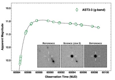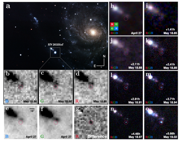 AST3-3的观测数据作为重要组成部分参与到了清华大学王晓锋教授牵头的对超新星SN2023ixf极早期激波辐射信号的观测与科学研究中(图2)。该研究成果在2023年12月14日以“A shock flash breaking out of a dusty red supergiant”为题在线发表在《自然》(Nature)上。清华大学博士生李盖茨是论文的第一作者,中国科学院紫金山天文台博士后胡茂凯、中国科学院国家天文台博士后李文雄、美国加州大学伯克利分校博士后杨轶为共同第一作者,王晓锋教授为通讯作者。