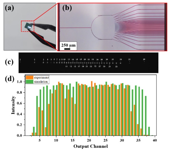 图1 1 40光分束器的结构图以及实验上测量的输出强度分布