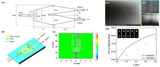 在小型化1 2光分束器的研究方面,该团队采用非对称锥形波导来逐渐改变光在锥形多模区域内的传播方向,在保证器件紧凑和低损耗(<0.4dB)的同时,实验上实现了50:50-75:25范围内的分光比调节,相关研究成果已整理并投稿,有望于近期发表。