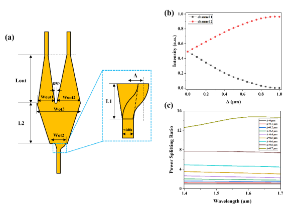 在上述研究的基础上,团队进一步优化了1 2集成光分束器的性能,采用锥形波导和S型波导组合来直接调控光在多模区域内的传输方向,可以在低损耗的情况下获得更大分光比的调节范围(50:50—100:0),同时能够在300 nm带宽内保证一定范围内分光比的一致性。相关成果申请了国家发明专利。