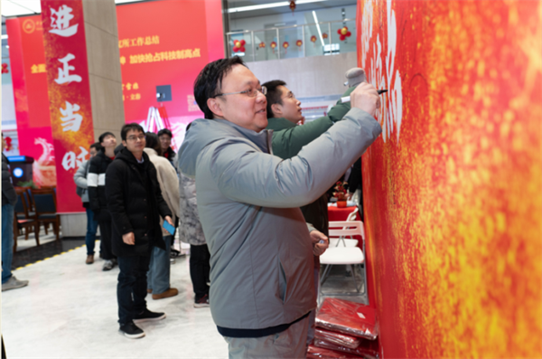 青年科学家们踊跃在“凝聚奋进力量,抢占科技制高点”签名墙上签名