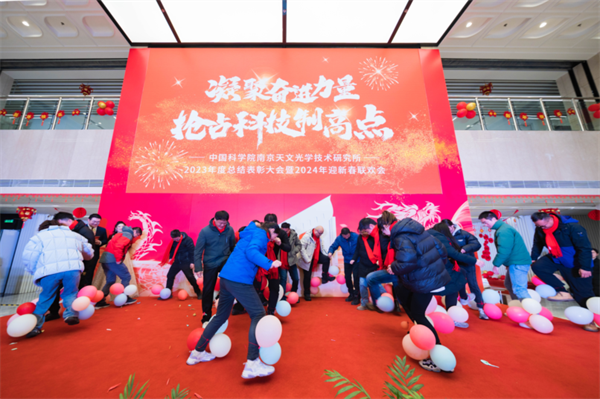 接下来进行的是由研究所工会牵头组织的2024年迎新春联欢会,由段然和关智文主持。联欢会在热闹的“啪啪、砰砰”踩气球活动中拉开序幕,各部门精心准备的节目精彩纷呈。诗歌朗诵《LAMOST金色的凤凰》将大家带回研制LAMOST项目那段激情燃烧的岁月。崔向群院士发表感言,回顾了LAMOST项目艰辛的研制历程,激励南京天光所人坚定自信,积极进取,弘扬天光所创新优良传统,着力攻克关键核心技术,勇于攀登科技高峰。会议还与我所坚守在南极、兴隆、高淳等地的科研人员现场连线开展新春慰问。