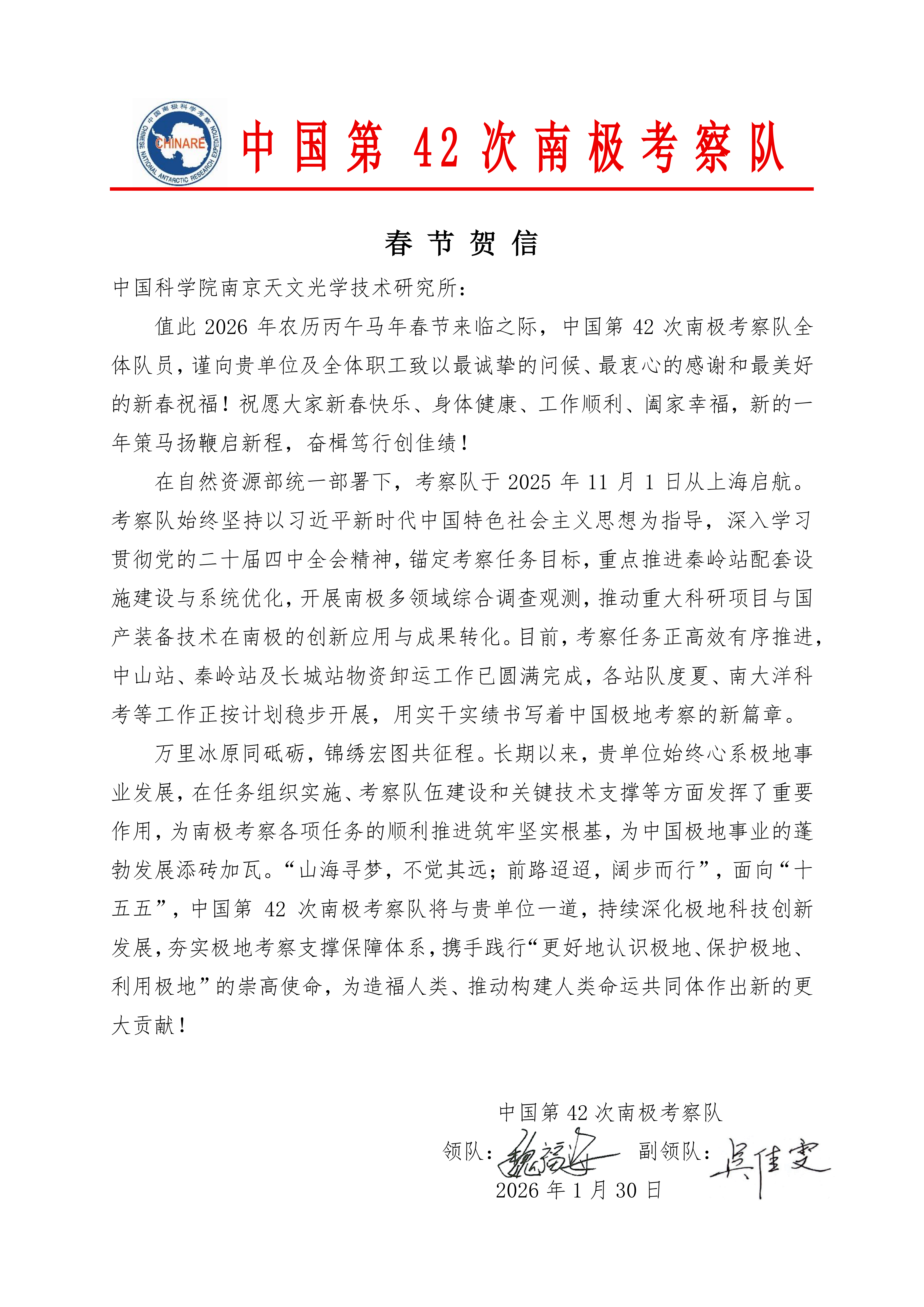 中国第42次南极考察队向南京天光所发来春节贺信